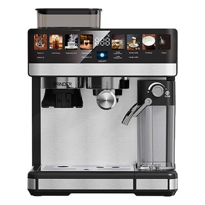 Master both hot and cold coffee drinks with this 20 Bar espresso machine featuring thermoblock heating system for fast, precise temperature control. The 1350W power delivers quick heat-up, while cold brew and cool milk functions let you create refreshing iced coffee alongside traditional espresso, cappuccino, and latte. The 2.6L water tank allows multiple cups without frequent refilling. The touch screen display makes operation intuitive, while the built-in adjustable grinder ensures freshly ground beans.